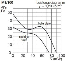 Ausführung | Standardmodell mit zwei Drehzahlstufen | Wie M1/100, mit codierbarem Nachlauf- und Intervallbetrieb * | Wie M1/100, mit Freuchteverlaufssteuerung *, **** | Wie M1/100, mit Präsenzmelder * |