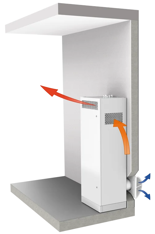 - Die Anlage ist für die Montage an einer horizontalen Oberfläche an einer Wand mit vorbereiteten Löchern für die Lüftungsrohre vorgesehen