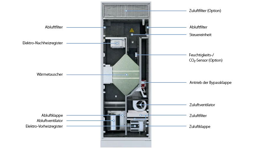 | Frostschutz | durch zyklische Abschaltungen des Zuluftventilators über Vorheizung (Option) | durch zyklische Abschaltungen des Zuluftventilators - |