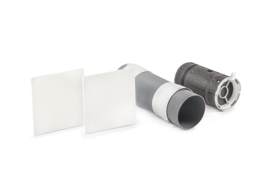 - Modul 2 – Außenset: Das Außenset beinhaltet eine Außenblende sowie einen Wandanschluss für die Außenmontage und sorgt für eine unauffällige und witterungsbeständige Installation.