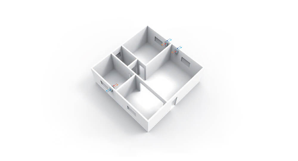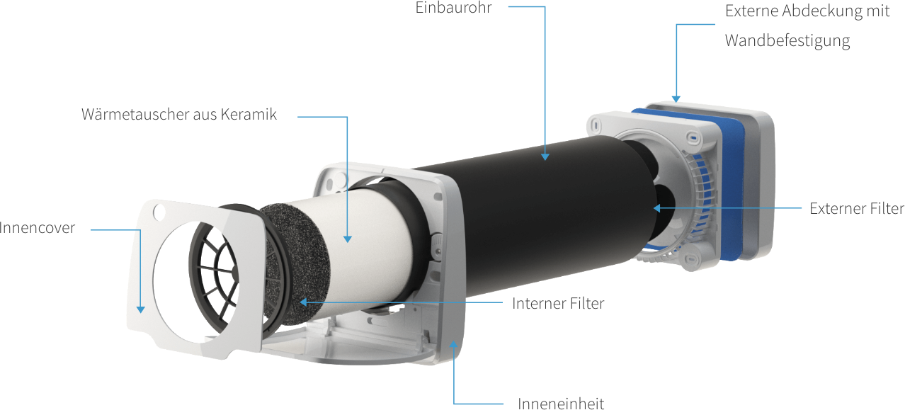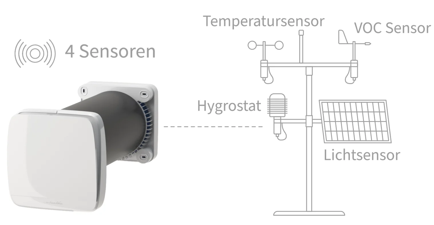 Durch die 4 integrierten Sensoren (in der Innenblende) entscheidet das Lüftungsgerät eigenständig, wie am besten gelüftet werden soll. Die 4 Sensoren sind: