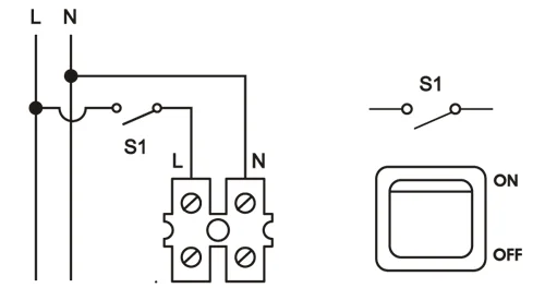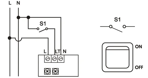 🠖 Der Außenleiter ist mit dem Lichtschalter oder einem separaten Schalter verbunden. Das Gerät wird beim Schalten aktiviert (Ausnahme: wenn der Badezimmerlüfter mittels integrierter Sensoren gesteuert werden soll)