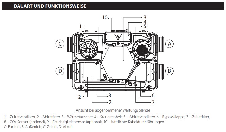- Effizienz der Wärmerückgewinnung: Bis zu 91 %. Das anfallende Kondensat wird in einer Auffangwanne gesammelt und abgeleitet.