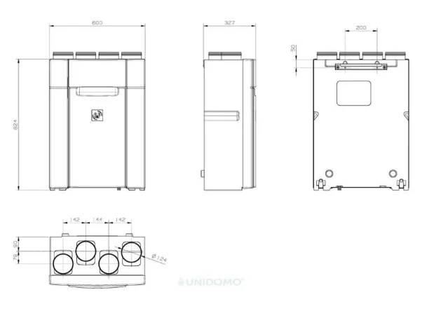 | Kanalanschluss | Nippel DN125 | 4 Anschlüsse (FOL/AUL/ZUL/ABL) an Geräteoberseite |