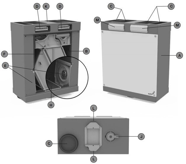 - F) Kreuz-Gegenstrom-Wärmetauscher oder Enthalpie-Wärmetauscher mit Bypasskanal und Kondensatsammler