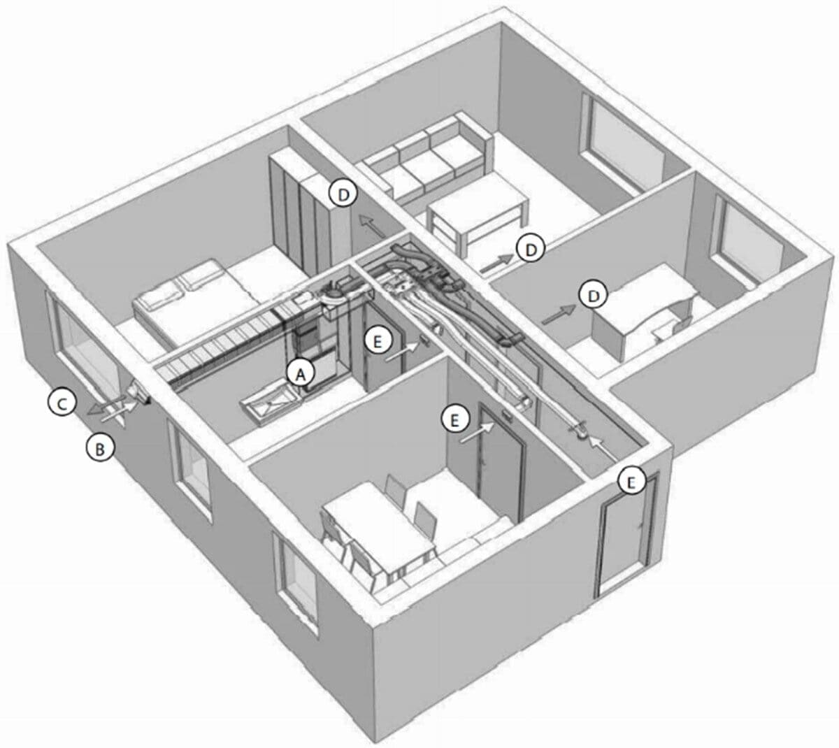 - (D) Zuluftauslässe in den Wohn- und Schlafzimmern