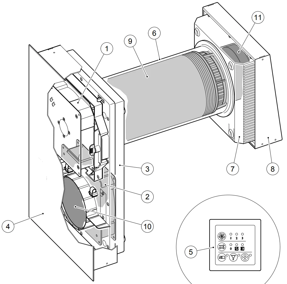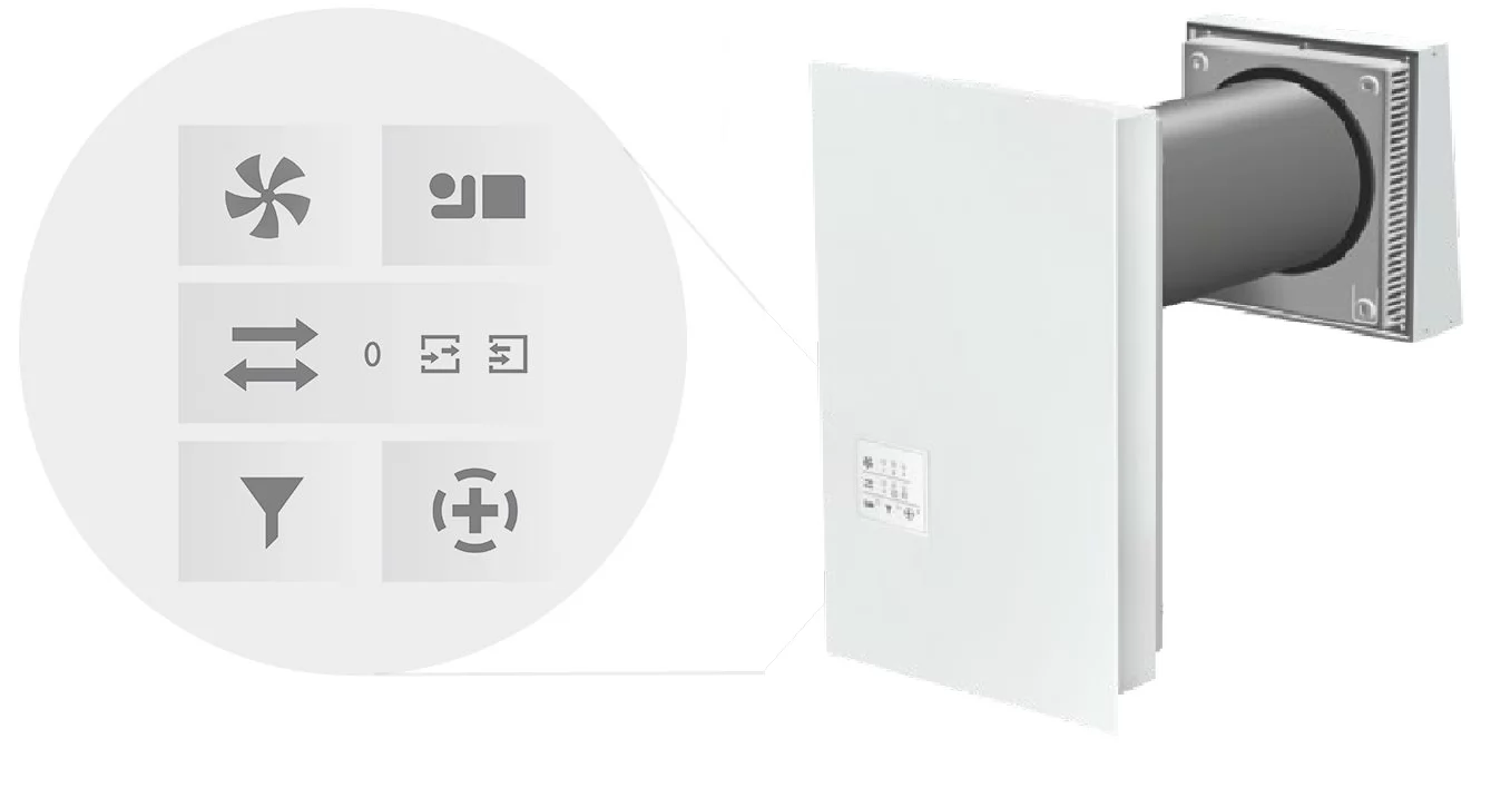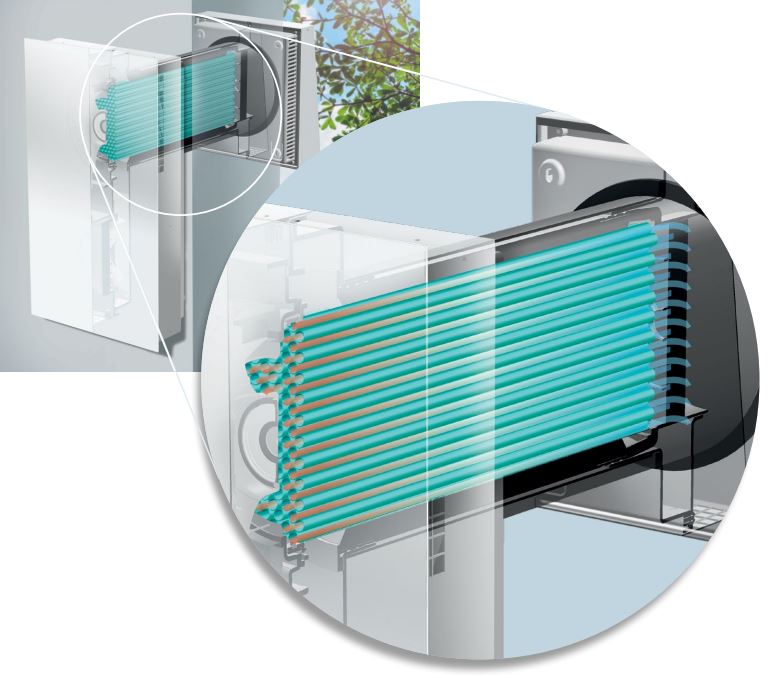 Während der Lüfter in Betrieb ist, findet gleichzeitig der Abtransport der Abluft sowie die Zuführung von Zuluft statt. Dabei passiert die ausgehende Luft einen Abluftfilter der Filterklasse G3 sowie die integrierte Wärmetauschereinheit. Letztere entzieht der Abluft die Wärmeenergie und speichert sie zwischen. Parallel dazu strömt frische Luft von außen ein, wird mit der zwischengespeicherten Wärmeenergie erwärmt und ebenfalls durch G3 Staubfilter geleitet. Allergiker können optional an dieser Stelle einen Pollenfilter einsetzen.