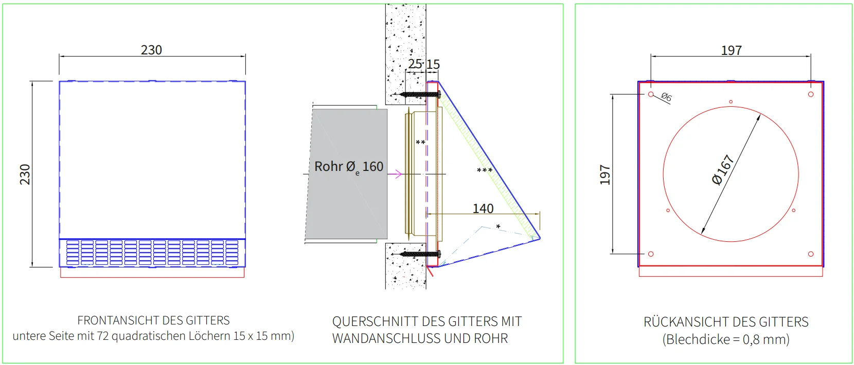 - 1x Außenwandbefestigung (Maße für 160mm: 230 x 230 mm )